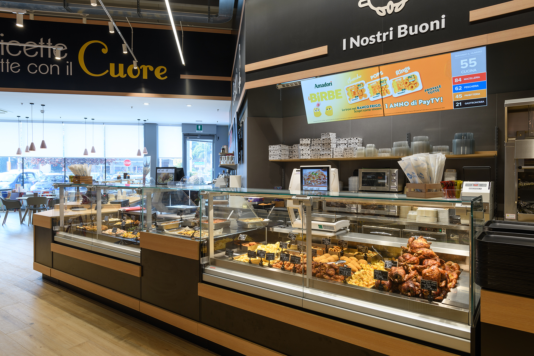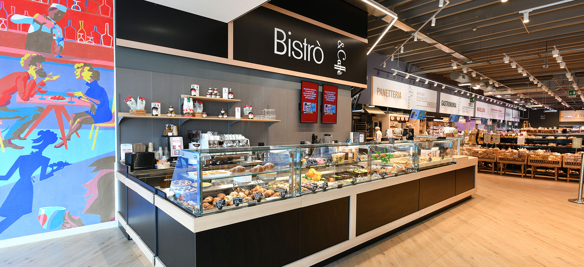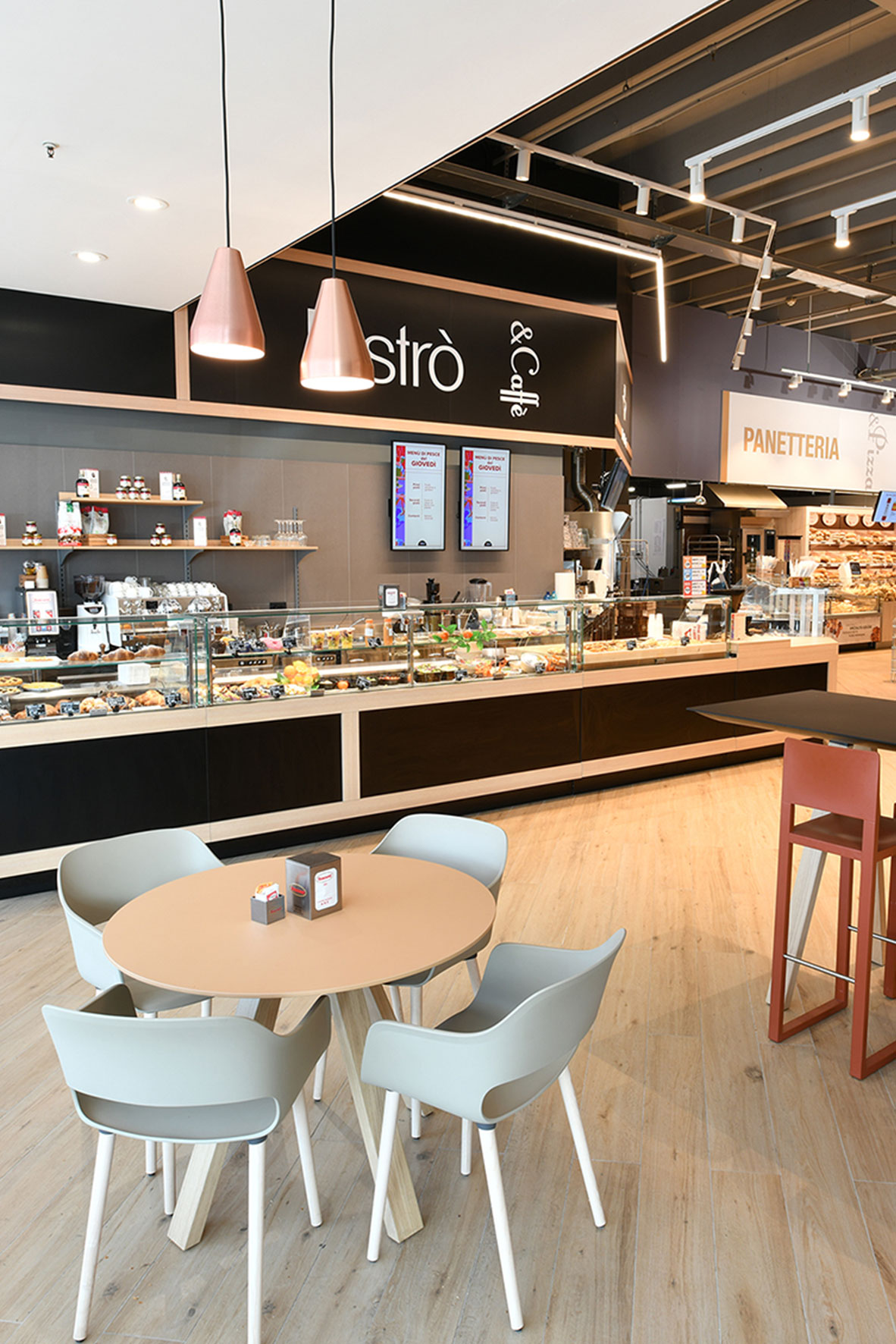 È stato completamente rinnovato il reparto Gastronomia Bistro, con banchi e banchi refrigerati custom, studiati e realizzati secondo le specifiche esigenze del cliente. Abbiamo fornito e installato inoltre tutti gli arredi del reparto – tavoli, sedie e complementi – integrando funzionalità ed estetica per un ambiente confortevole e accogliente.