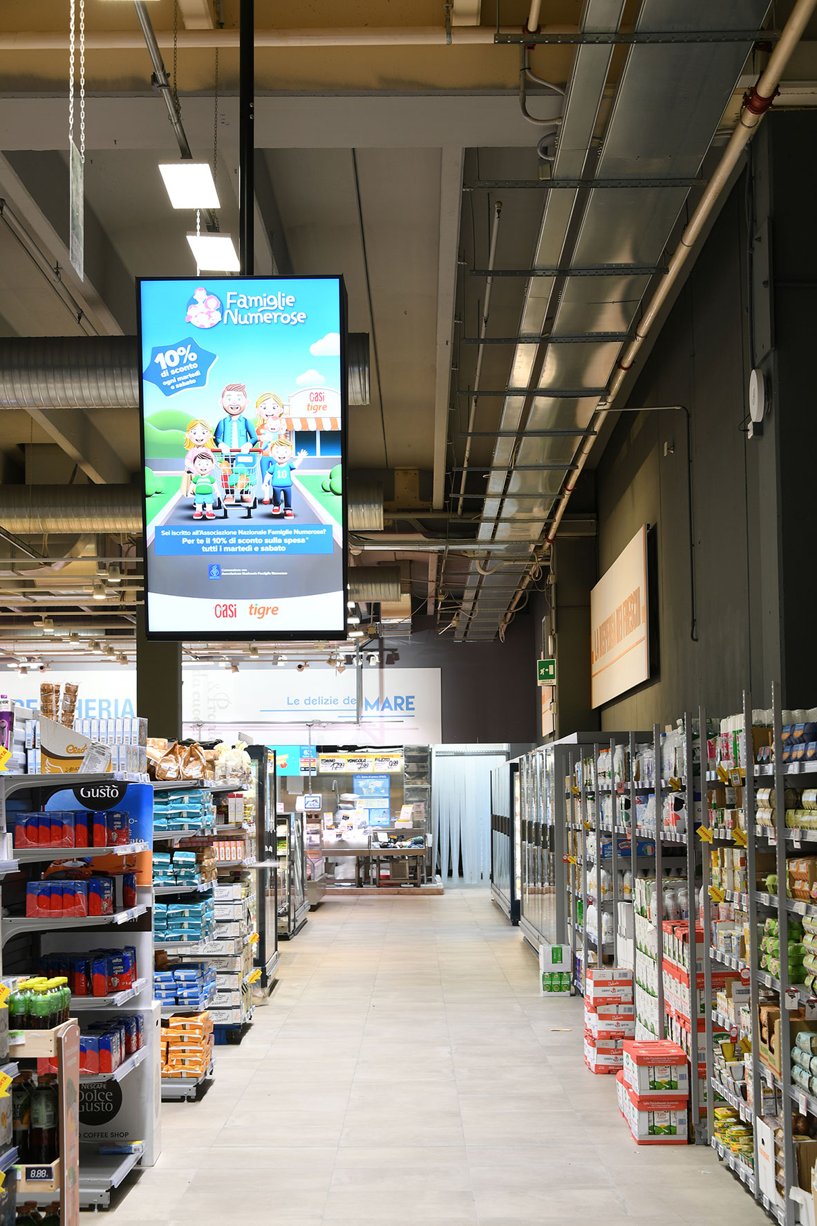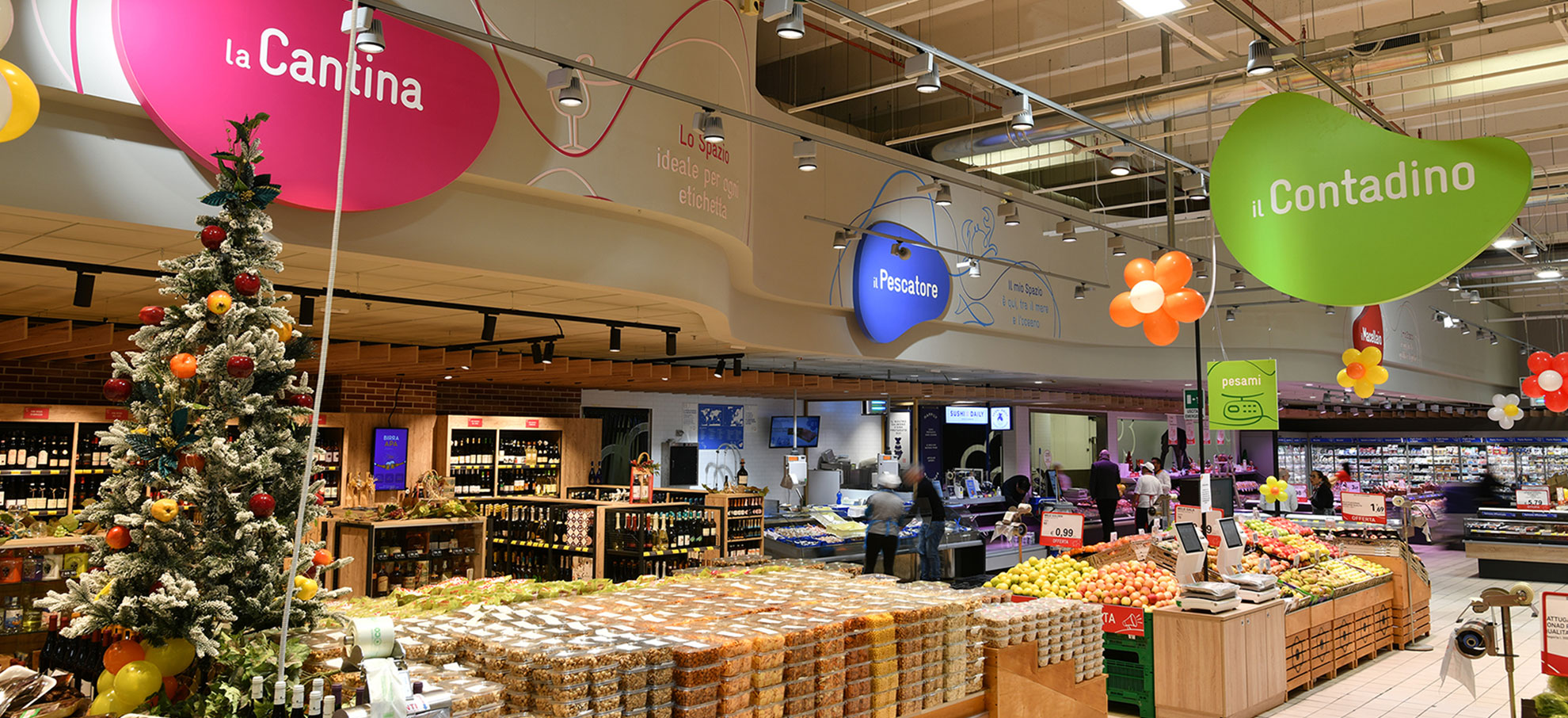 Presso l’ipermercato Oasi di Porto San Giorgio, SAGA ha curato la progettazione esecutiva e la realizzazione completa della nuova comunicazione aerea, sviluppando la segnaletica dei banchi servizi e non servizi secondo il nuovo format del Gruppo Gabrielli. L’intervento ha incluso anche la progettazione e l’allestimento dell’ambientazione della galleria e del passaggio fronte casse, per un percorso cliente più chiaro, moderno e coerente con l’identità del brand.